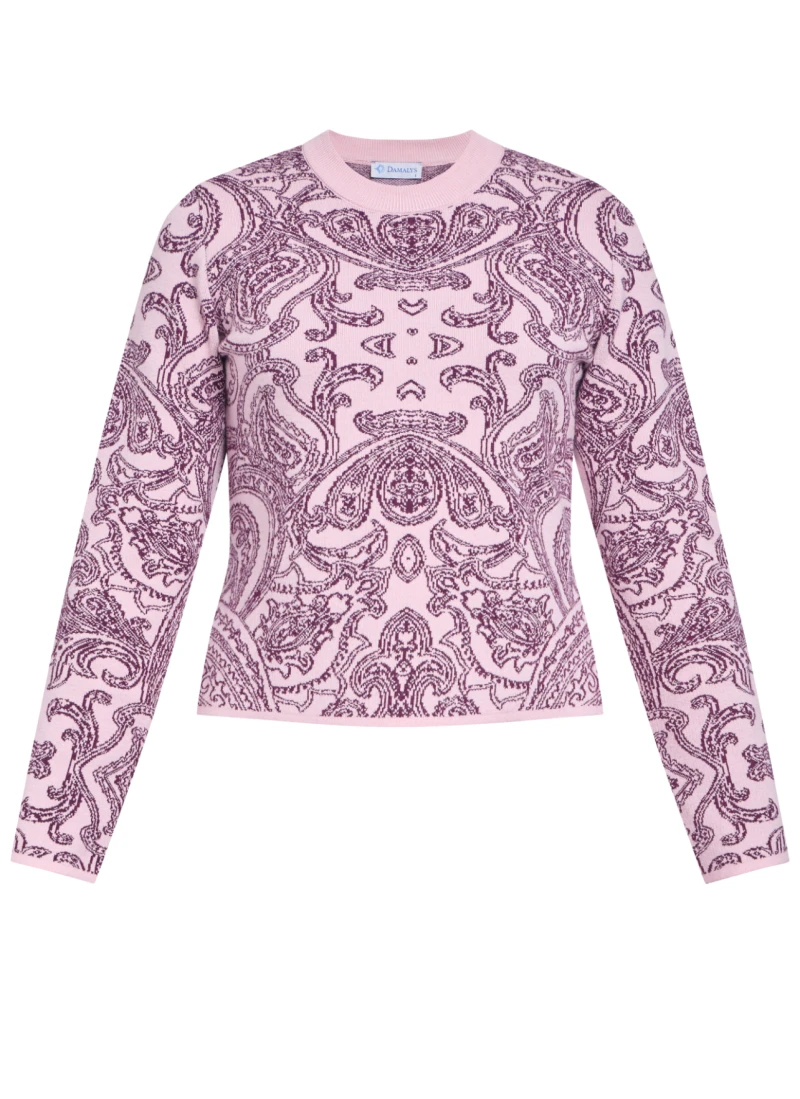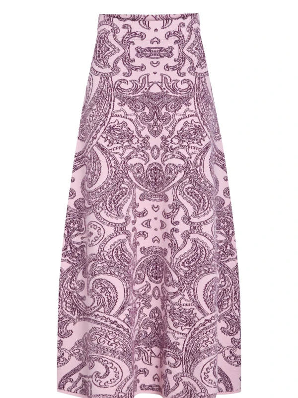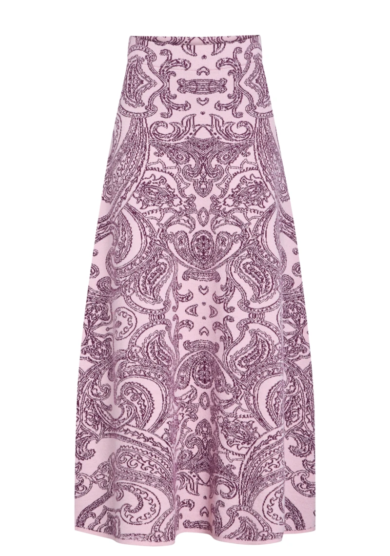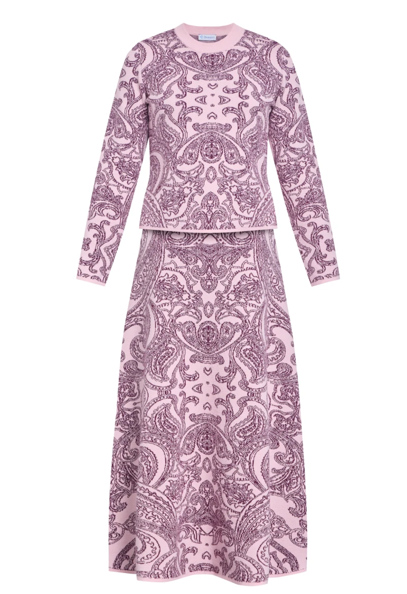 Skirt and sweater knitwear set available in two sizes: 1 and 2. The skirt has an elastic waistband. A soft-textured, specially woven paisley pattern skirt and sweater set made from a cotton-wool blend.