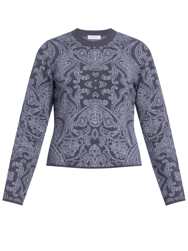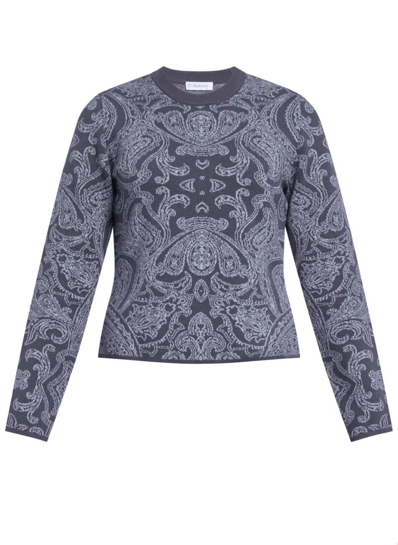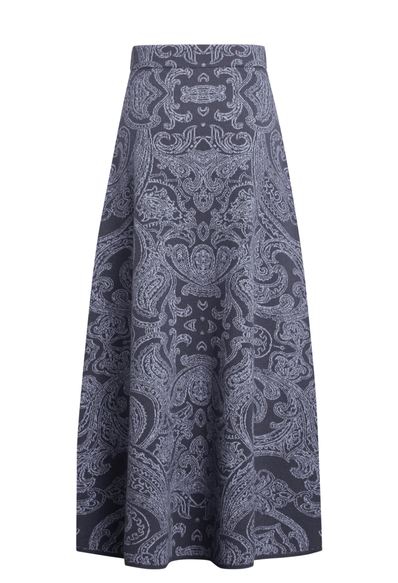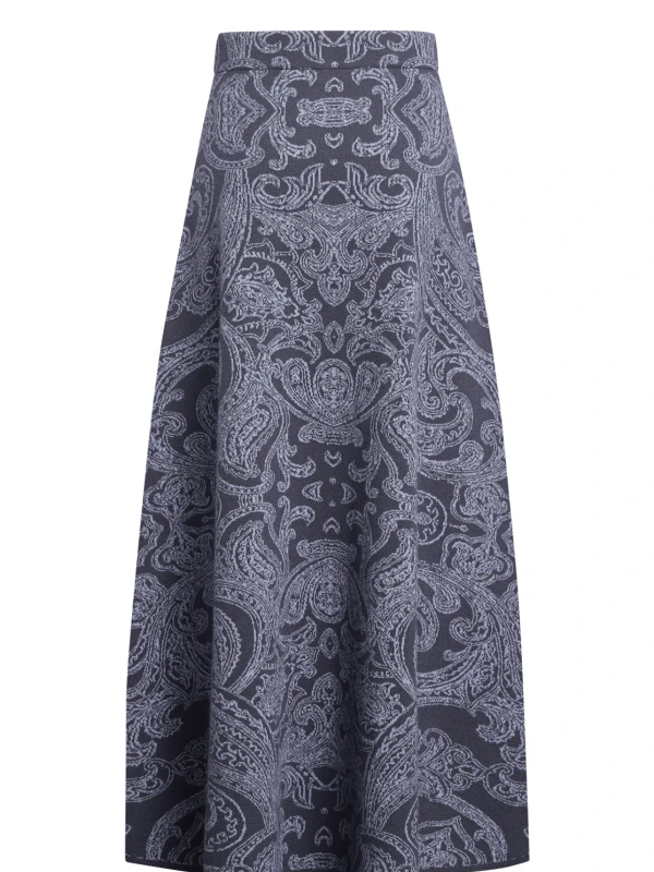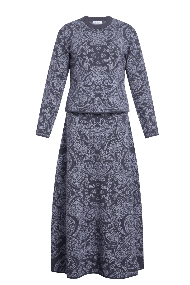 Skirt and sweater knitwear set available in two sizes: 1 and 2. The skirt has an elastic waistband. A soft-textured, specially woven paisley pattern skirt and sweater set made from a cotton-wool blend.