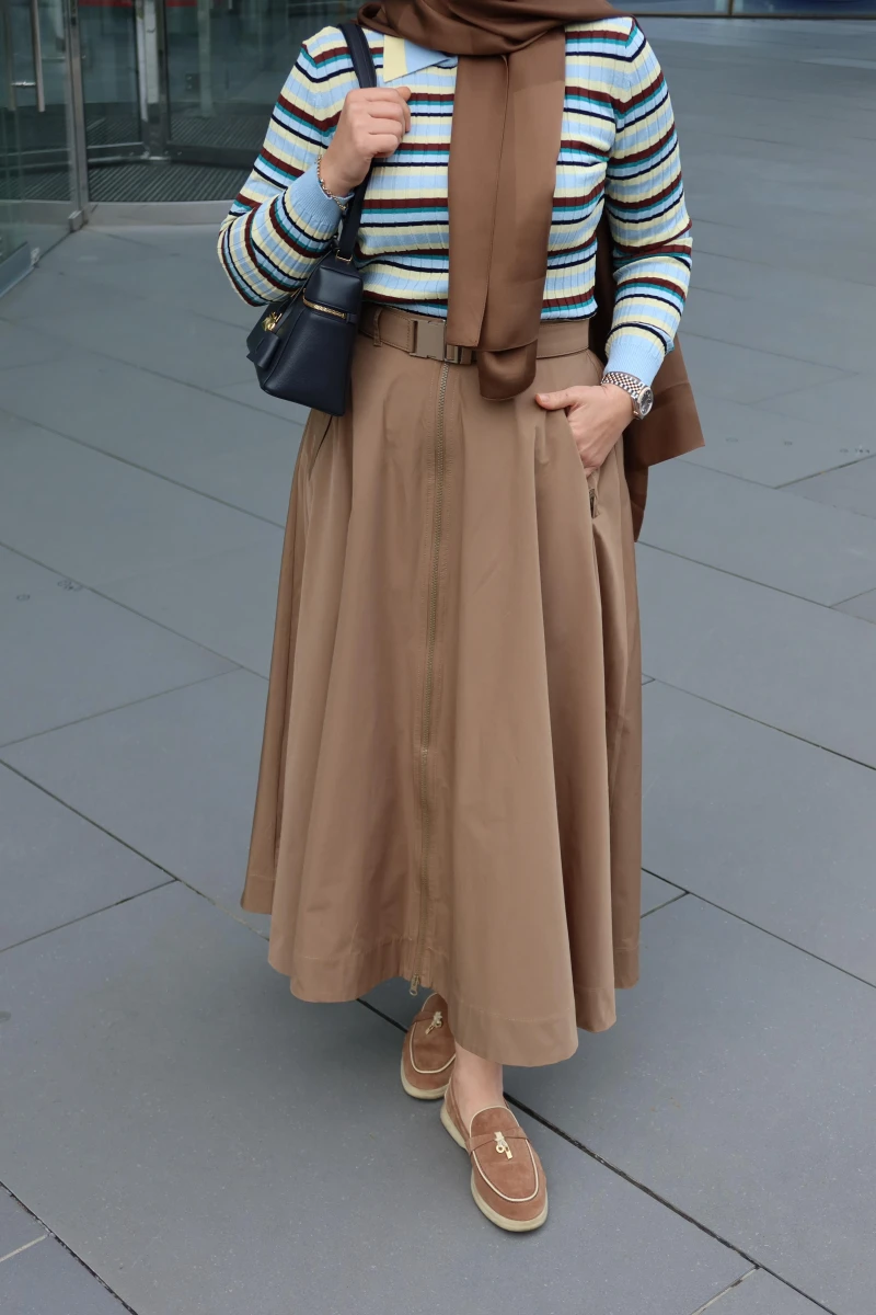 Front-zip skirt with elasticated waistband at the back, pocket details, and belt accessory.