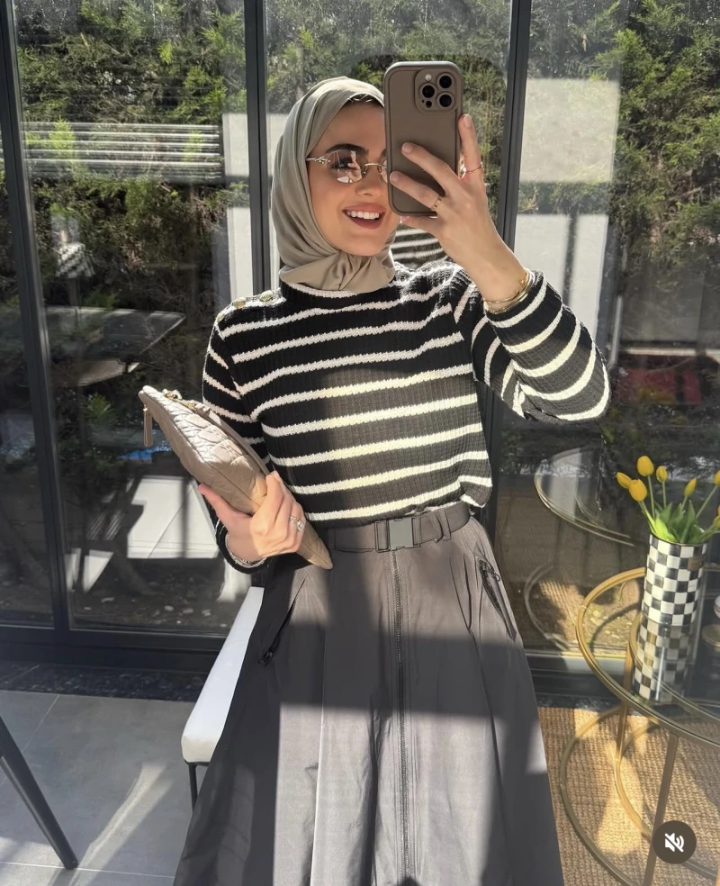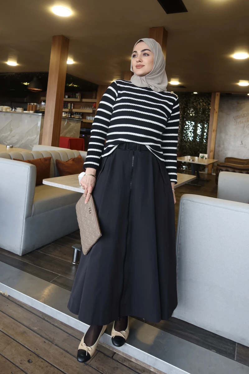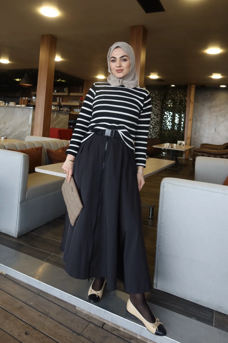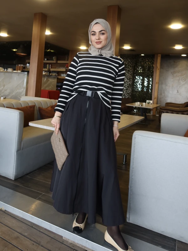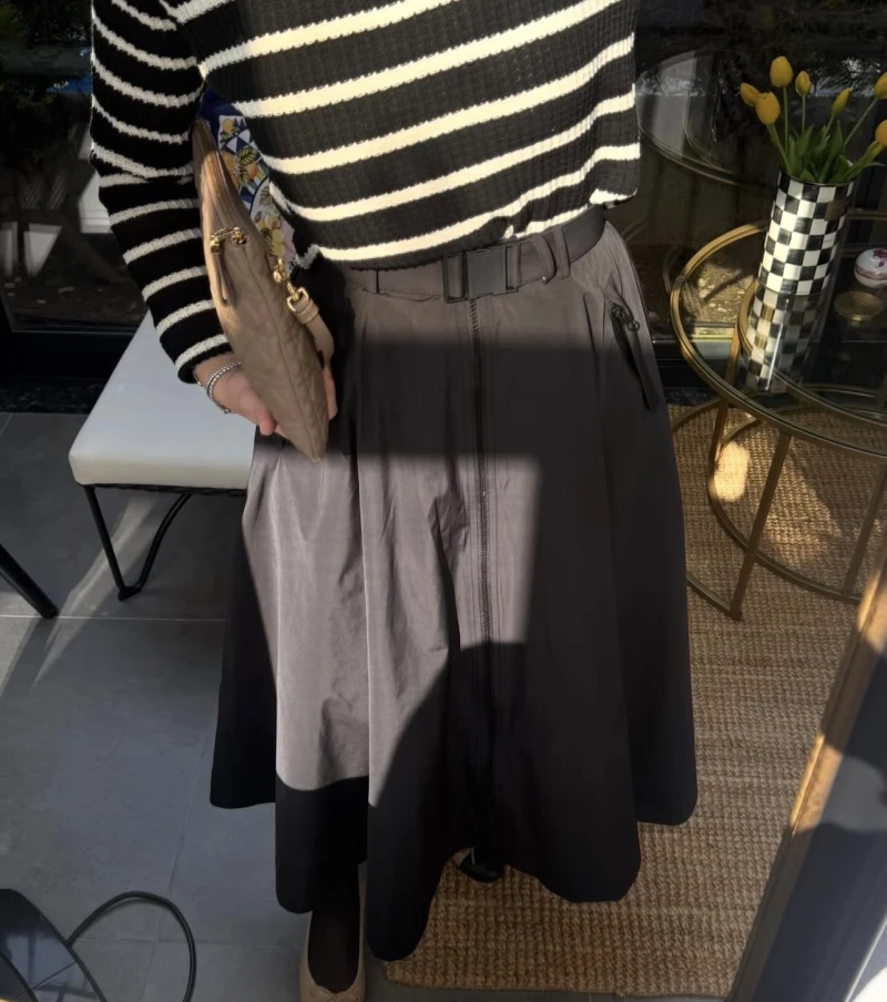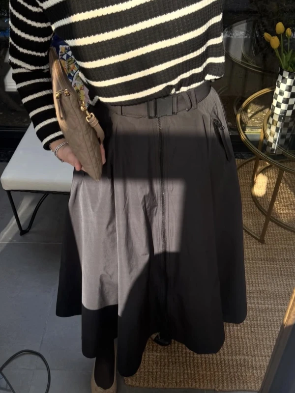Front-zip skirt with elasticated waistband at the back, pocket details, and belt accessory.